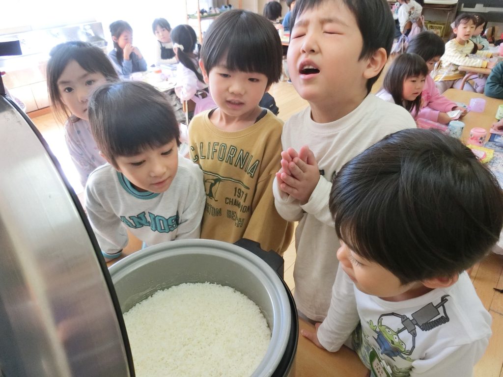 炊き立てのご飯の匂いや湯気に「いいにおい~!」「すごーい!」と歓声が!