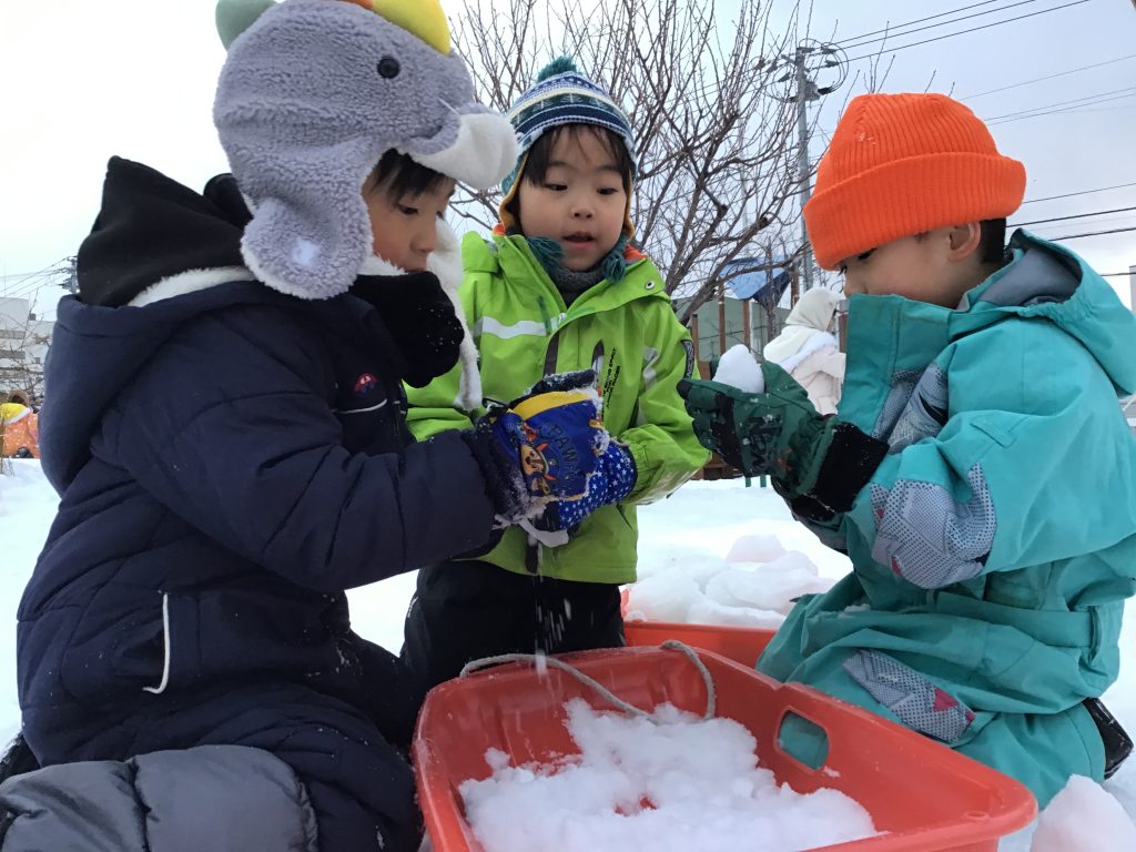 ここでは、5歳児と4歳児が雪の塊を見つけてどっちが大きいか比べていました。