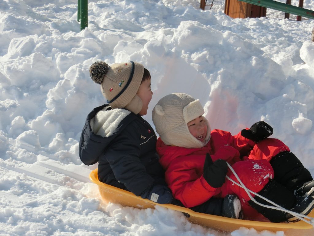 こちらではそり滑りを楽しんでいました。お友達と一緒に滑ったり、保育教諭と一緒に大型そりに乗って滑ったりと存分に雪遊びを楽しんでいましたよ!