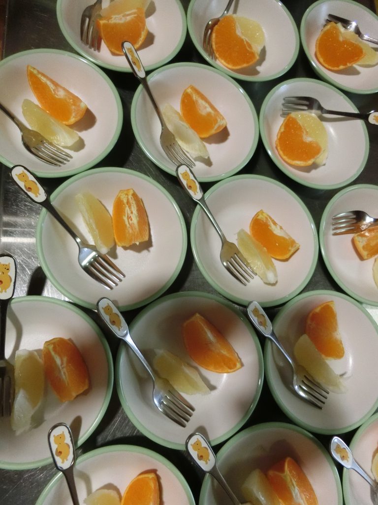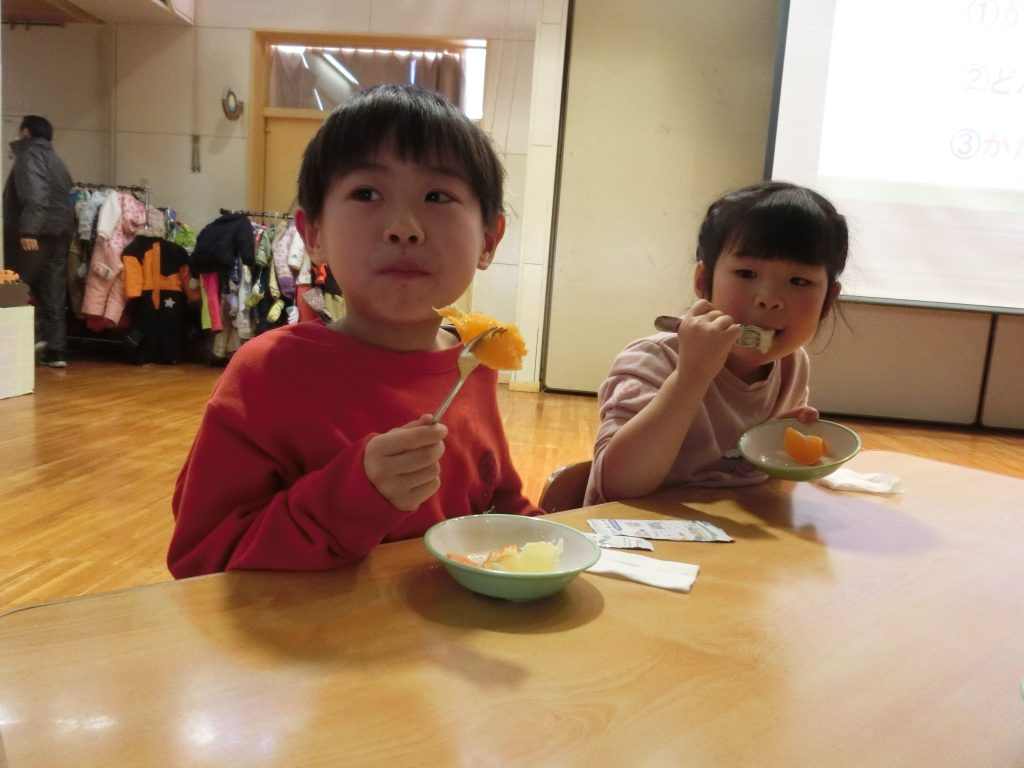 みんなで食べたのは、愛媛県産の甘平と宮崎産の日向夏です。「こっちの味がすき!」「甘くておいしい!」など子どもたちが感じたことを伝え合い、食材への興味や関心もより高まったと思います。