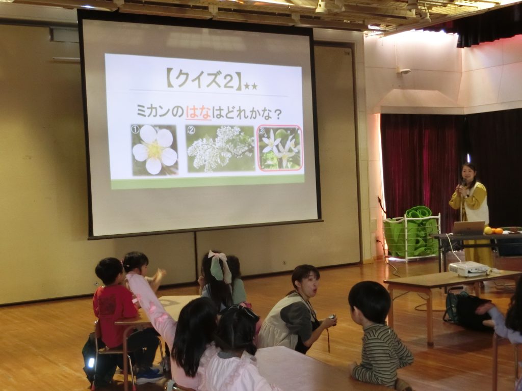 今年度は”みかん”などの柑橘類について、当園の食育・給食プランナーである森平和歌子さんが、子どもたちにわかりやすくお話してくれました!