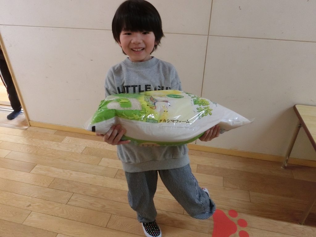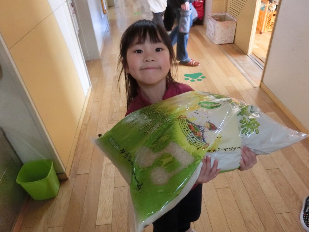 保育教諭が昨日届いたお米を給食室に運んでいると、「ぼくも持てるよ!」「明日うまいでぃ?たのしみ!」と言いながらなんと!10Kgのお米の袋を持ち上げる力自慢も☆