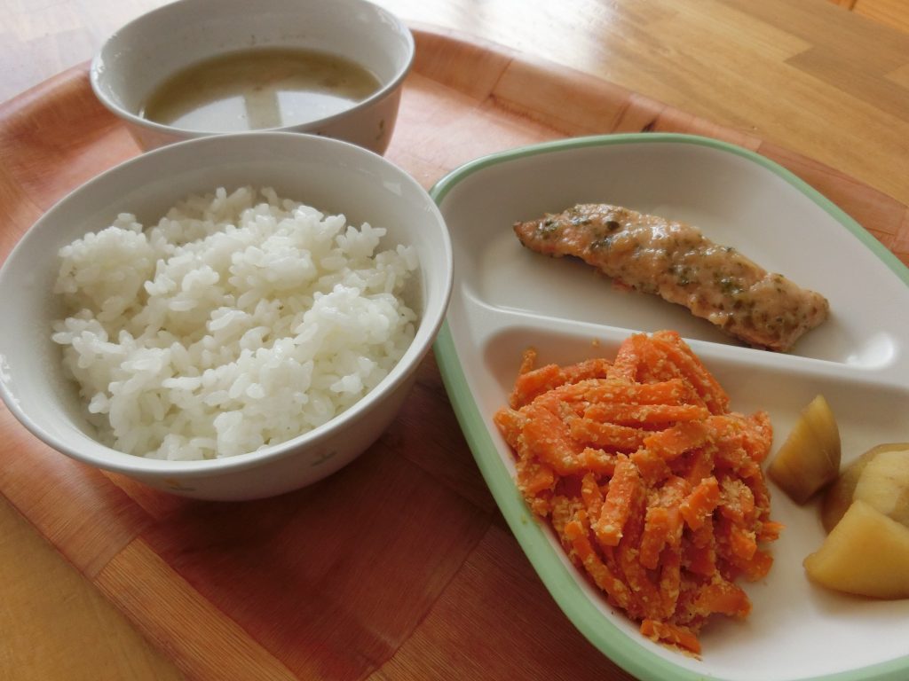 今日の献立は…ごはん(ななつぼし)、豆乳味噌汁(ごぼう・油揚げ)、鮭の磯部焼き、人参のごま和え、さつま芋の含め煮 でした!