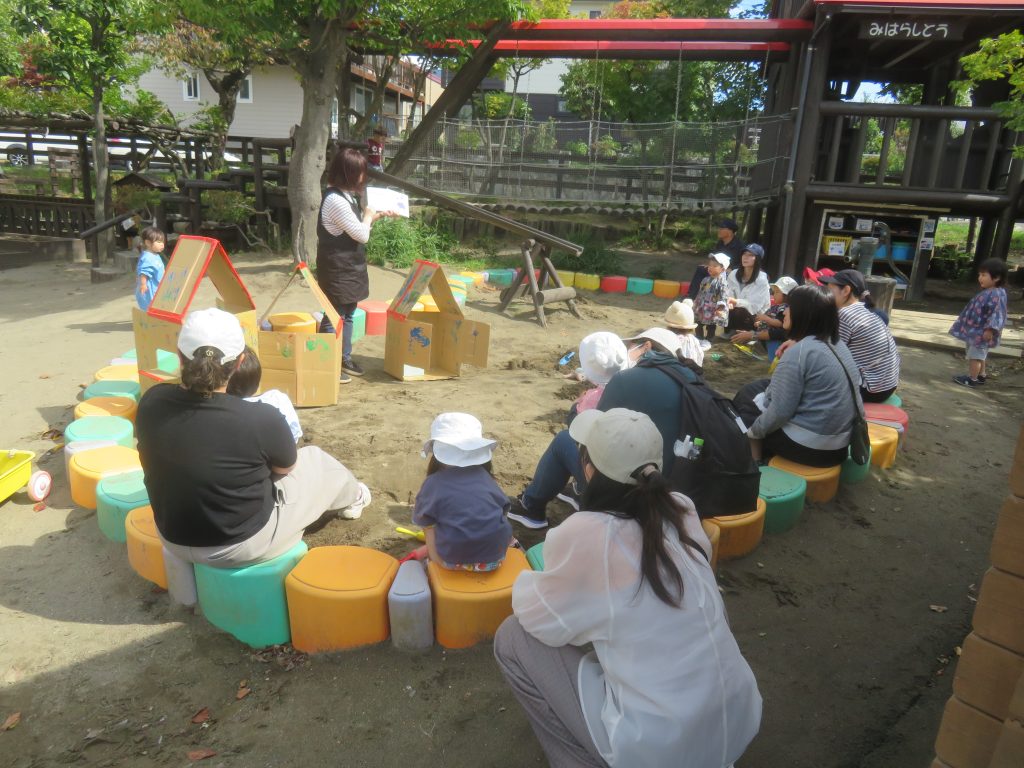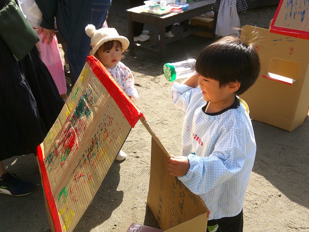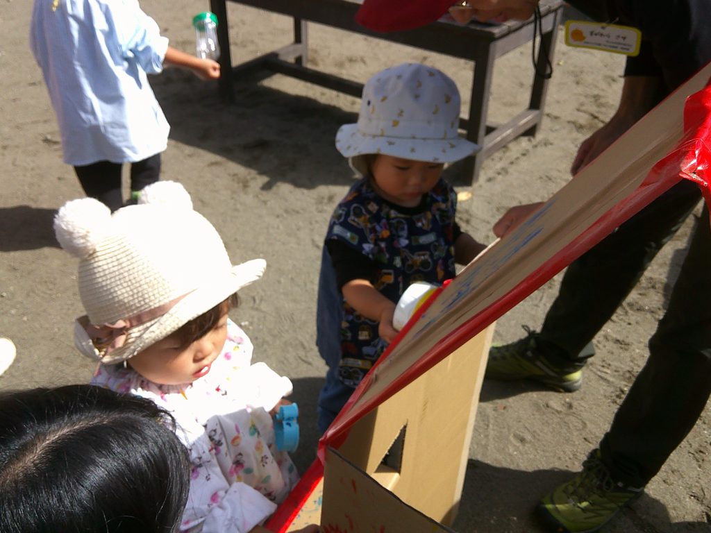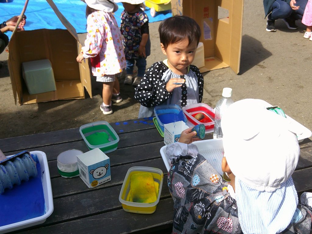 親子でスタンプ遊び、気持の良い秋晴れの中