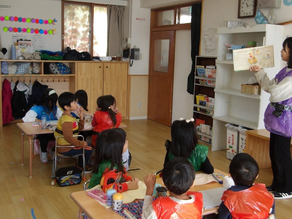 5歳児しらかば組さんは、皆で絵本を読んでいます。