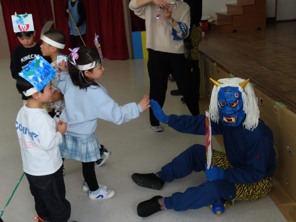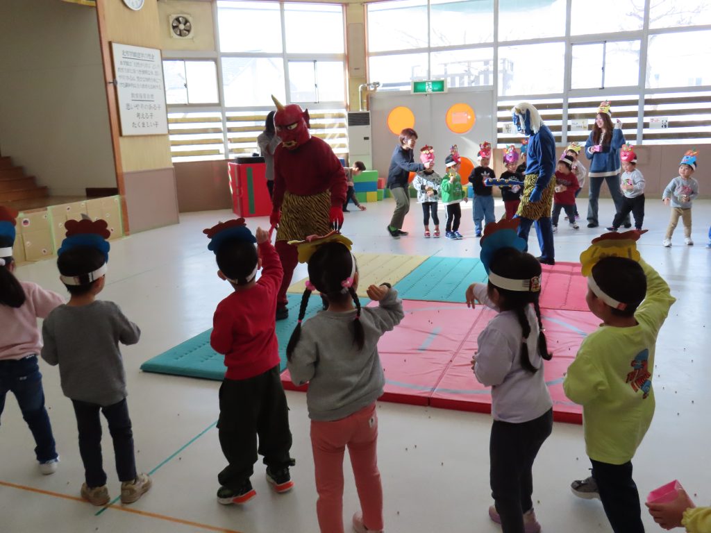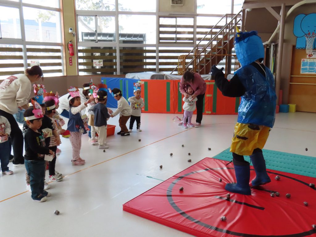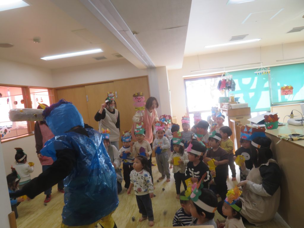 さっそく、お面を付けて豆まきをしました。