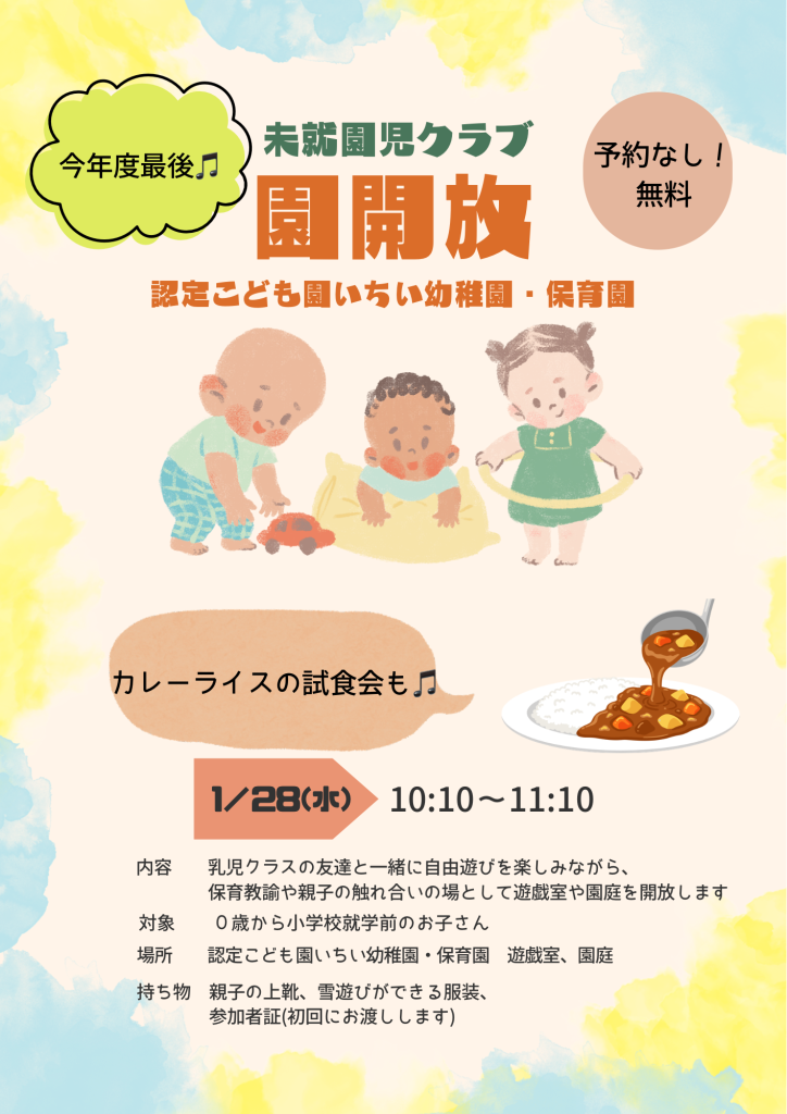 1/28(水)10:10~11:10に今年度最後の園開放があります!