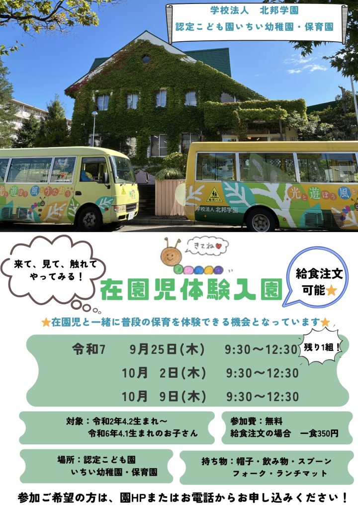 9月25日(木)、10月2日(木)、10月9日(木)9:30~12:30に在園児体験があります☆