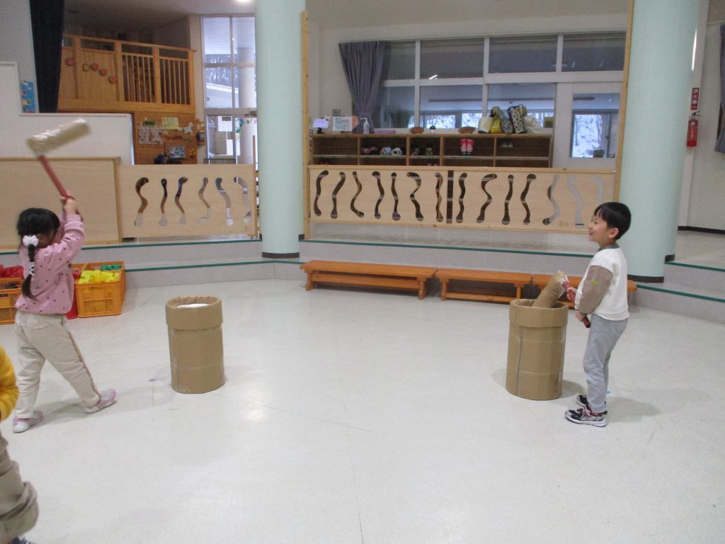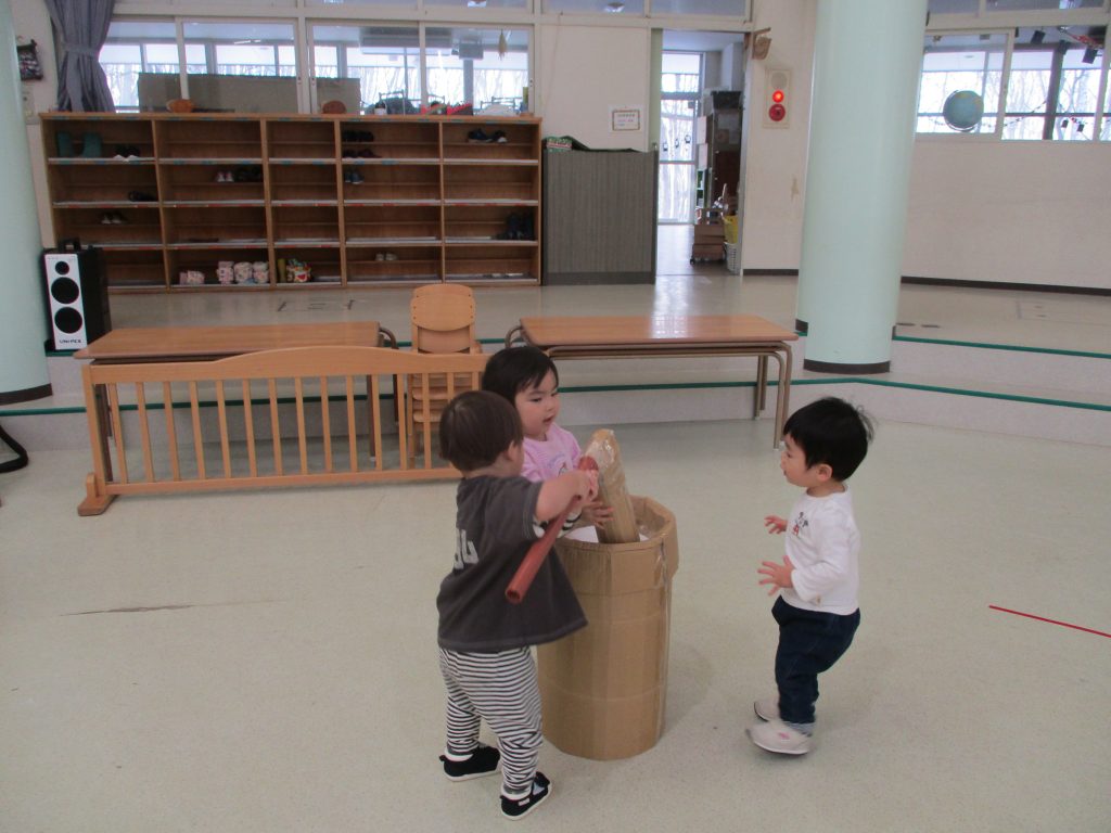 楽しかった御餅つき。その後も、先生お手製の「おもちつきマシーン」で、もちつきごっこを楽しむ子ども達です♪