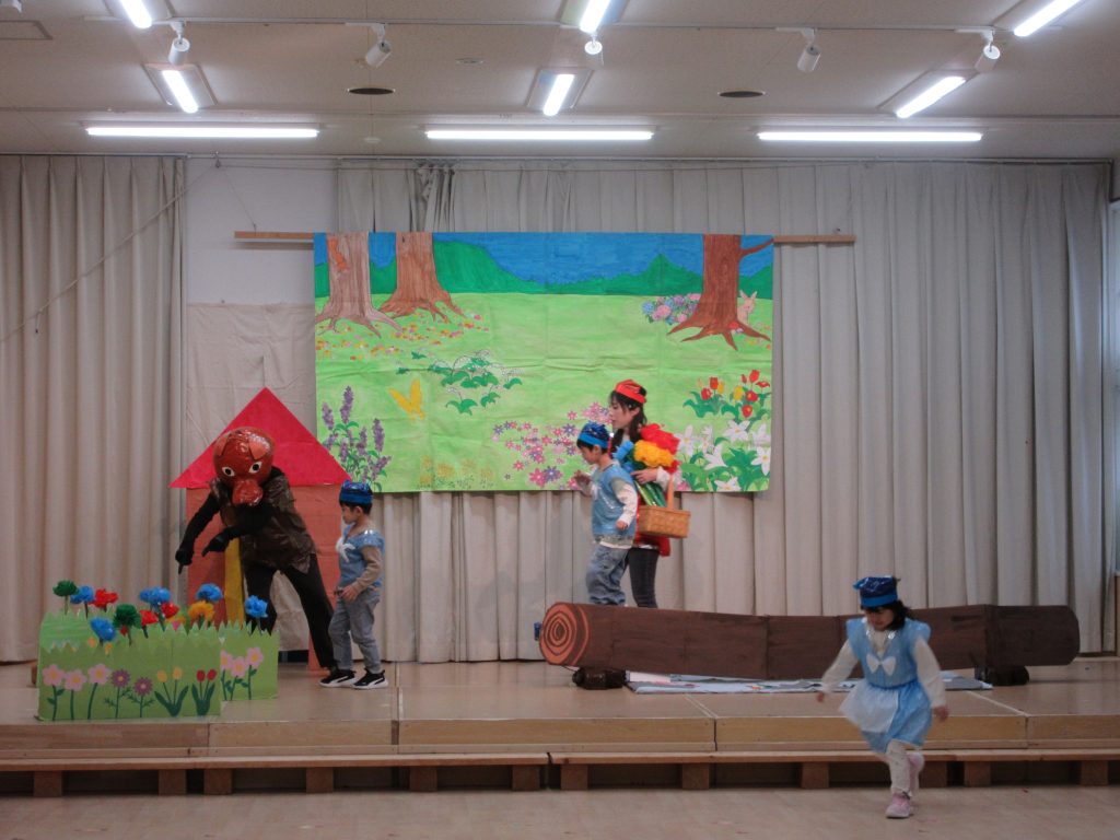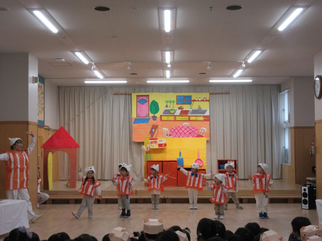 どの子もお話のイメージを膨らませ、ステージ上で友達と一緒にごっこ遊びを楽しんでいます。のびのび体を動かして踊るダンスがとってもかわいらしいので目が離せません(^^♪