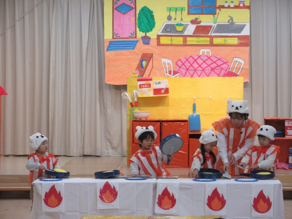 しろくまちゃんのほっとけーきのお話では、ダンスの力でコンロの火を点火し、ほっとけーきを焼きますよ!ひっくり返すのがとっても上手な子どもたちです。