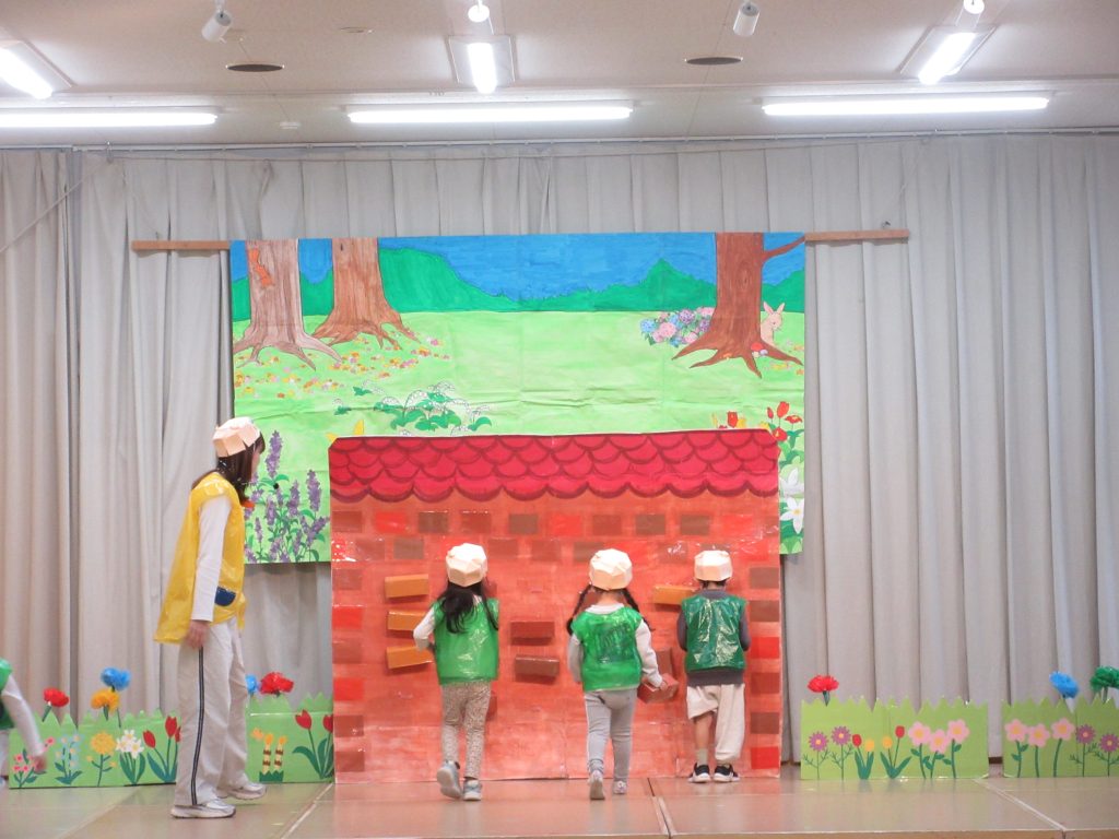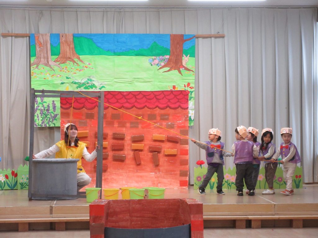3匹のこぶたのお話では、またまた吹き飛ばされないようにレンガのおうちを作ったり、オオカミさんをアツアツお風呂に入れるため井戸からお水を汲んだりします。