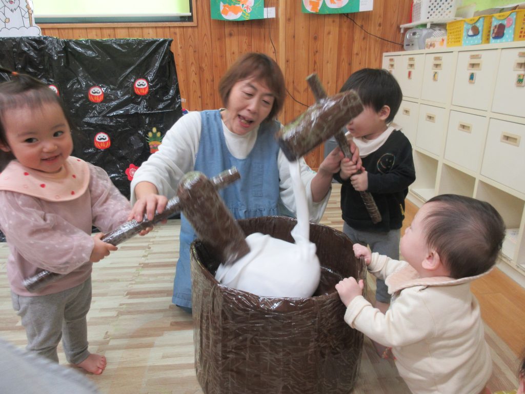 乳児クラスでは、干支の話やおもちを食べると元気が出ることなどを楽しく聞き、もちつきごっこ遊びをしました。のびるおもちに大喜び☆(実はタイツを利用して、お餅ののびる様子を表現しました)