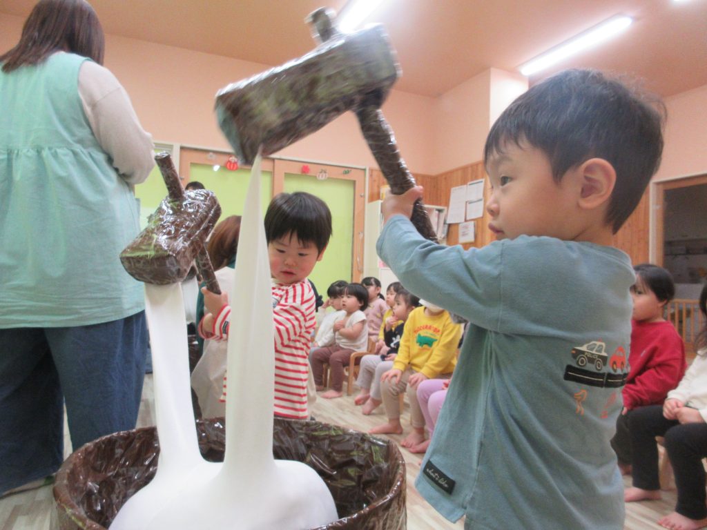 経験のある年長さんは「ちょっと緊張するなぁ」とつぶやきつつも、力いっぱい振りかぶり、素敵な見本となるもちつき姿を見せてくれました。みんなで掛け声をかけながら、来年もよい年になりますようにと、もちつきを頑張りましたよ☆