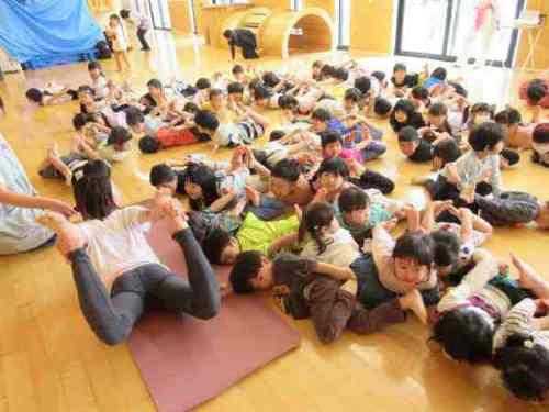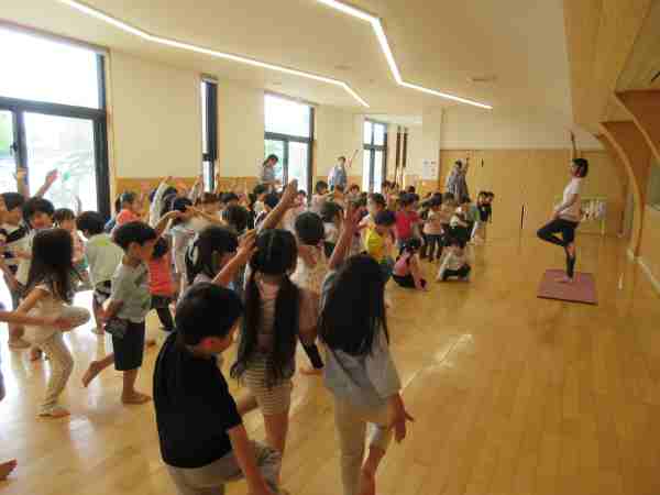 一般的なクラスでの一斉活動ではなく、自由遊びの中で、興味関心を持った子どもたちが自由に参加できるプログラムを、インストラクターのSHIHOさんを講師にお招きして行ったところ、森を探検しながらいろんな動植物に変身!というストーリーにひかれて、どんどん参加者は増えていきました。楽しみながら全身を動かせる、こうした機会を継続していく予定です。 ※画像は粗く加工しています