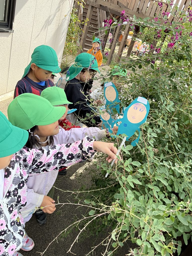 顔を描いて、頭の上に咲かせる花や葉っぱを探しに園庭に出発!!