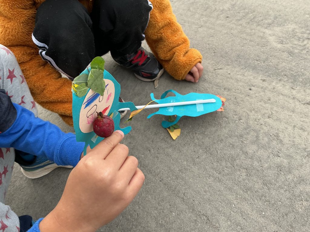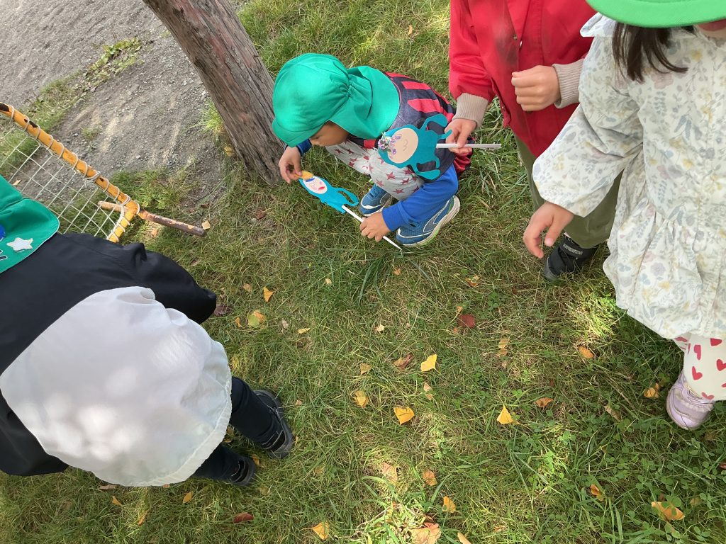 「黄色の葉っぱが良いかも!」「お洋服にもしてあげよう!」と想像を膨らませて秋の自然に触れて楽しむ子どもたち🍂