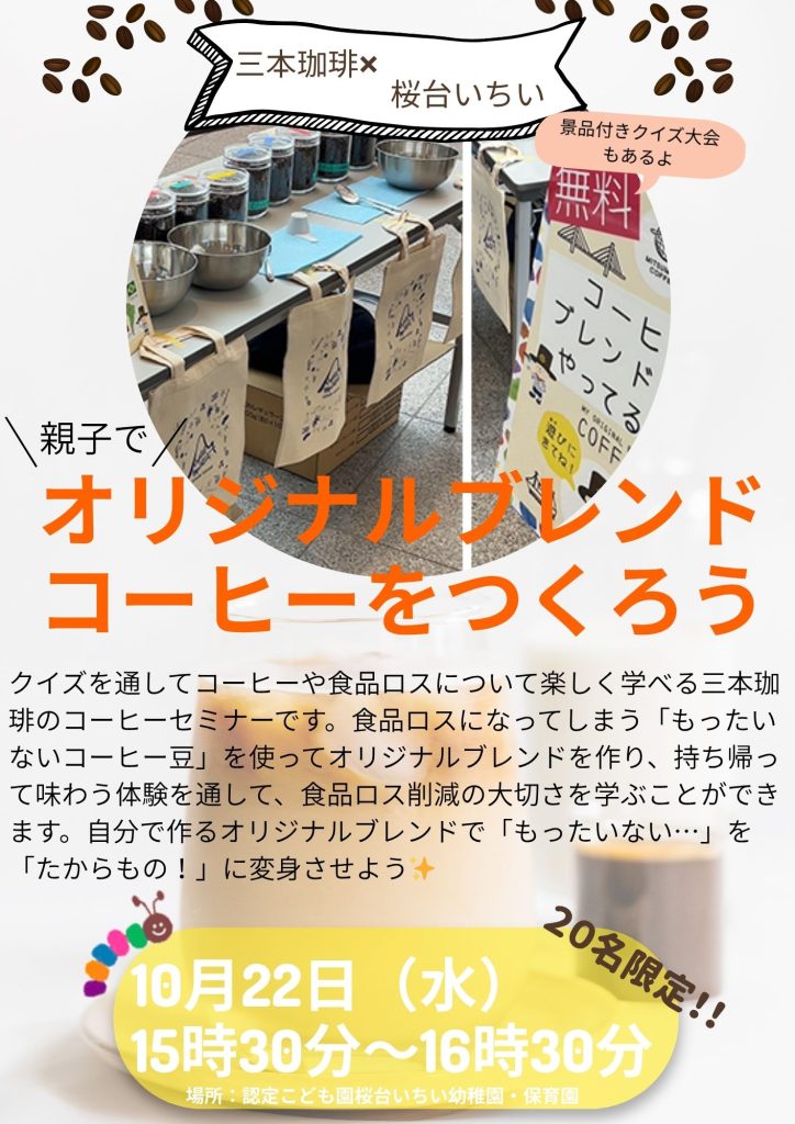 10月22日(水)に『親子で自分だけのブレンドコーヒー豆をつくろう』というイベントを行います。アリオ札幌でも行われ、大人気だったイベントを桜台いちいで開催決定♪